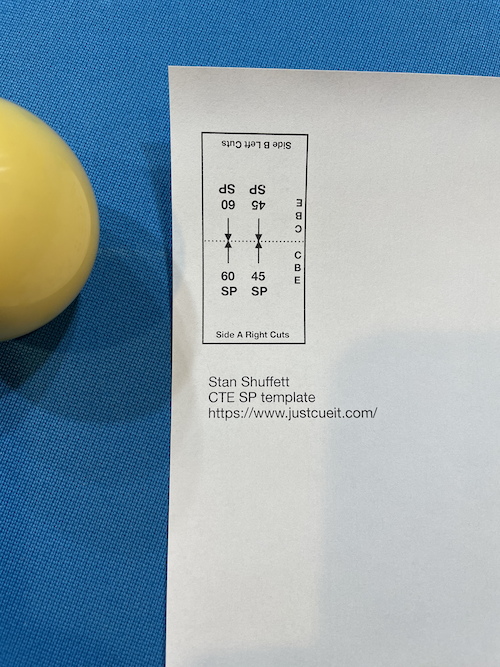 My bridge hand is a soft squishy thing (as Dave Segal stated), it is not a precision instrument. But, it is not crucial to be precise. I only need it in a proximity so that I can turn my cue onto the CCB perception I’m looking at. Through experience I have trained myself to always place my bridge hand very close to that proximity, which to be honest is nearly identical for shots longer than a diamond. We know that for the shorter shots the bridge needs to be closer. Well, a close inspection when on the 1/2 tip offset will indeed show you the line through the cue ball core is a steeper one. I recall during a lesson with Stan watching him pivot the cue on a shorter shot. The butt of the cue was moving considerably more than the longer shots, and that makes complete sense.
